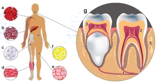 Sources of mesenchymal stem cells. This illustration shows human tissue sources: (a) peripheral blood, (b) liver, (c) bone marrow, (d) muscles, (e) skin, (f) adipose tissue and (g) dental tissues: (1. apical dental papilla, 2. dental pulp, 3. pulp from the exfoliated deciduous tooth, 4. periodontal ligament, 5. alveolar bone) [29].