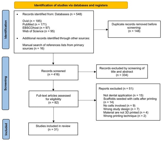 This revised search strategy generated 548 records from four databases: Ovid (n = 185), PubMed (n = 171), EBSCOhost (n = 97) and Web of Science (n = 95) through May 2022. In addition to electronic databases, a manual search of reference lists was carried out through primary sources and additional eligible studies were added (n = 16). Out of these, a total of 148 duplicates were excluded and 334 records were assessed based on their titles and abstracts. This was performed by using the online literature review application, Rayyan software (http://rayyan.qcri.org (accessed on 9 September 2022)) [40]. Moreover, full texts of the 82 articles were retrieved for eligibility based on the inclusion and exclusion criteria. Out of those, 51 were further excluded because the articles were not for dental application (n = 15), scaffolds seeded with cells after printing (n = 14), no cells involved (n = 9), wrong study design (n = 7), materials are not 3D printed (n = 4) and wrong printing technique (n = 2). Finally, there were 31 articles included in this review, as recorded in Figure 4.