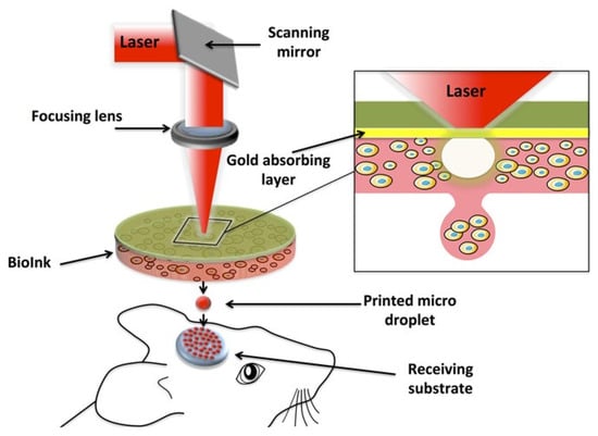 Intra-operative bioprinting (IOB) using laser-assisted bioprinting (LAB) approach in vivo application. LAB setup comprises a pulsed laser beam, a ribbon (transparent glass slide coated with a laser-absorbing layer of metal) and a receiving substrate. Reproduced with permission [56]. Copyright 2017 SpringerNature publishing under a Creative Commons Attribution 4.0 International (CC BY 4.0). (https://creativecommons.org/licenses/by/4.0/ (accessed on 21 August 2022)).