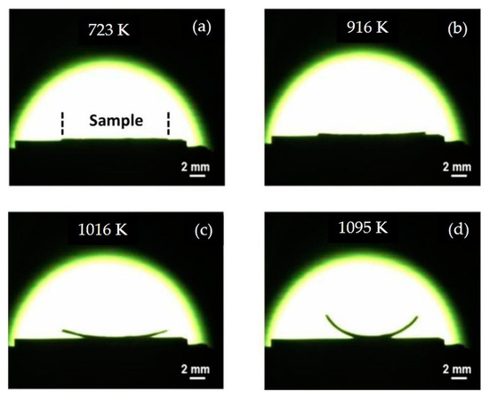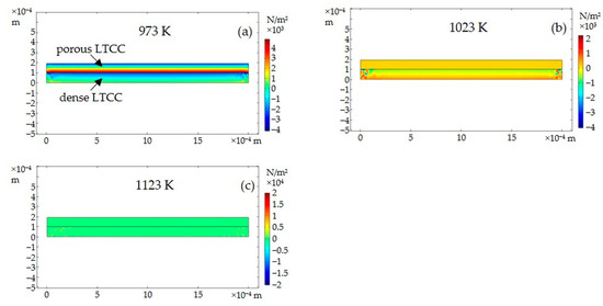 - At high temperatures (above 973 K), porous LTCC begins to densify, generating compressive stresses within the dense LTCC. Due to the low rigidity of the bilayer linked to its low thickness, a camber appears, allowing the relaxation of stresses generated by the densification of the porous LTCC.