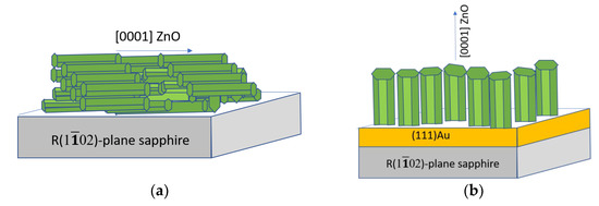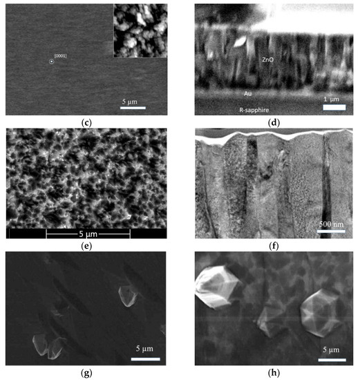 - Muslimov, A.E.; Tarasov, A.P.; Ismailov, A.M. Cathodoluminescence of ZnO Films on a Rhombohedral Plane of Sapphire with a Gold Buffer Layer. Tech. Phys. Lett. 2020, 46, 1223–1226. [Google Scholar] [CrossRef]