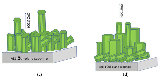In accordance with the structural and geometric similarity of the film and substrate lattices, for the synthesis of [110]-oriented ZnO films with their basal axis lying in the plane of the substrate, the use of the rhombohedral R (102) sapphire plane is suitable [27,31]. In this case, the lattice mismatch remains 1.53% along the [0001] direction of ZnO. As we found previously [32], [103] ZnO films are formed on the M (100)-plane of sapphire.