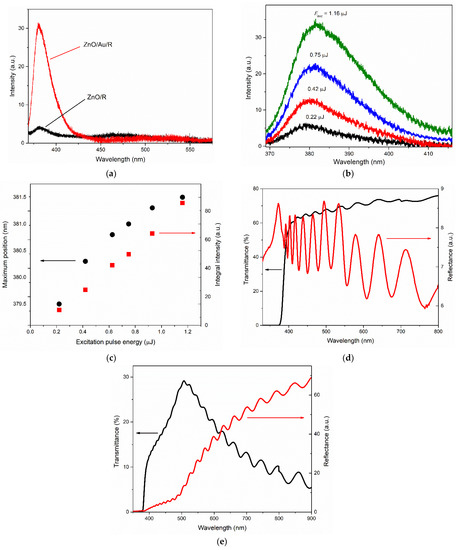 Optical and emission properties for the type-R-I and type-R-II films: (a) PL spectra of type-R-I film (black) and type-R-II film (red) recorded at excitation pulse energy Eexc ≈ 0.4 µJ; (b) NBE emission spectra of type-R-II film at different Eexc; (c) dependence of NBE emission integral intensity (red squares) and maximum position (black circles) on Eexc for type-R-II film; (d,e) transmittance (black) and directional reflectance (red) spectra for type-R-I film (d) and type-R-II film (e).