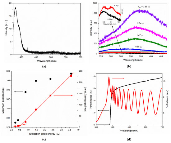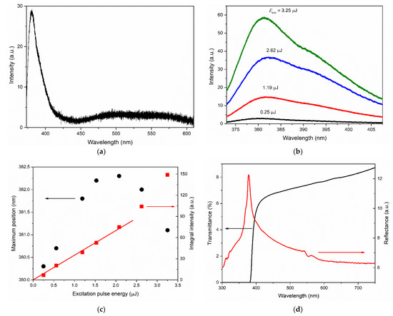 Optical and emission properties for the type-M film: (a) PL spectra recorded at Eexc ≈ 0.25 µJ; (b) NBE emission spectra at different Eexc; (c) dependence of NBE emission integral intensity (red squares) and maximum position (black circles) on Eexc; (d) transmittance (black) and directional reflectance (red) spectra.