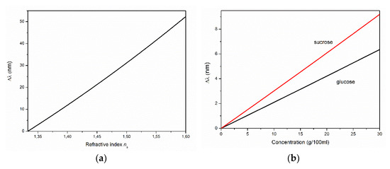 As an example, Figure 7 shows an estimate of the shift of one of the interference fringes with m = 13 at α = 45° with a change in (Figure 7a), as well as in the concentrations of glucose and sucrose in aqueous solutions in contact with the ZnO film with d = 3 µm (Figure 7b). For the estimates, we used the linear approximation from [51] and the dispersion of from [52]. The sensitivity calculated from Figure 7 was ~190 nm/RIU. With sufficiently narrow interference bands (in the case of thick films), a shift of several nanometers can be easily tracked. The use of a narrow band source and/or two interference films can significantly increase the sensitivity of such a sensor. In this case, for example, films of types R-I, R-II, and/or M can be combined.