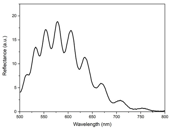 When developing an analyzer device, the developed structure (one or several) can be fixed, for example, in a standard spectrophotometer cuvette or, when working in flow mode, in a transparent tube. Unlike many sensors, such as waveguide-type ones, interference films do not require the use of laser radiation—it is sufficient to use a conventional LED. As an example, Figure 8 shows the reflectance spectrum obtained from the type-R-II film when illuminated with a conventional commercial LED.