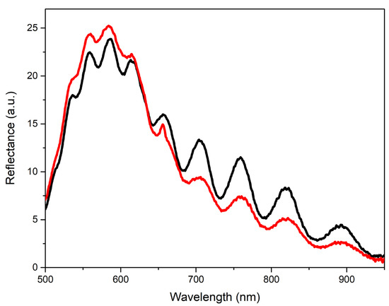 Reflectance spectra of a type-R-II film before (black) and after (red) covering it with a protecting Al2O3 nanolayer recorded under illumination with an LED source under the angle of ~60°.