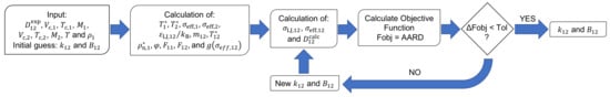 The optimization of the parameters ( and ) was performed using the Nelder-Mead simplex algorithm described in Lagarias et al. [] and codified in the fminsearch function of Matlab R2017b [], adopting AARD (Equation (1)) as objective function. The model performance was assessed in terms of AARD (%) and average relative deviation (ARD, %, Equation (20)). A flowchart of the optimization procedure can be observed in Figure 1.