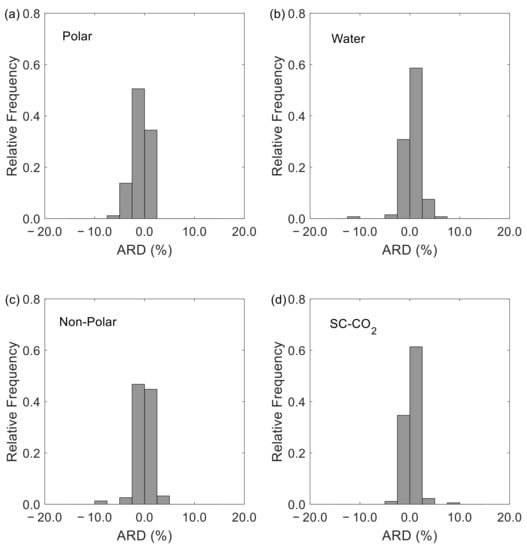 Generally, no bias was observed in any subset of systems as demonstrated by the ARD values of −0.36%, −0.31%, 0.16%, and 0.35% for the polar, non-polar, water, and SC-CO2 systems, respectively. These observations are further highlighted in Figure 1 where one confirms that only three systems exhibit ARD values above 10% or below −10%. Interestingly, these systems are the same as those mentioned above (in the AARD analysis) and present ARD values of −16.94%, −18.07% and −11.15%.
