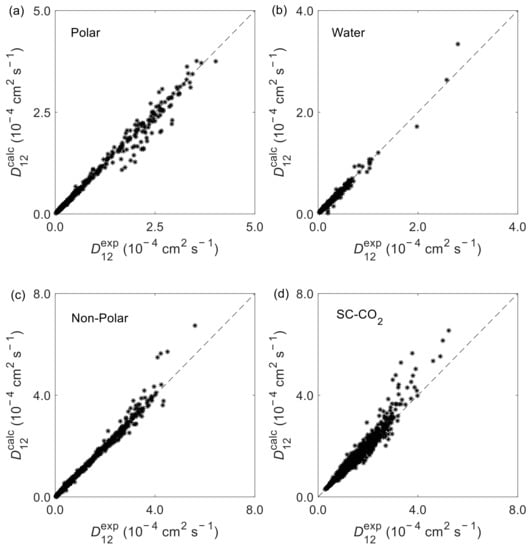 Calculated () vs. experimental ( ) binary diffusion coefficients for systems with: (a) polar solvents, excluding water; (b) water as solvent; (c) non-polar and weakly polar solvents, excluding SC-CO2; and (d) SC-CO2 as solvent.
