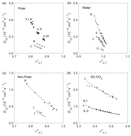 The experimental and calculated vs. is presented in Figure 5 for various solutes and solvents at fixed temperature and pressure. In general, the results are accurately described by the new model. For the polar systems shown in Figure 5a (i.e., ethanol/propane (A) at 298.15 K, 323.15 K, and 348.15 K [], ethyl acetate/quercetin (B) at 1 bar [], and ethanol/palladium(II) acetylacetonate (C) at 1 bar []) an excellent representation can be observed especially for systems B and C. Regarding the subset of water as solvent (see Figure 5b), the comparison of the experimental and calculated diffusivities of methane (D) [,], ionic liquid [Bmim][PF6] (E) [], alanine (F) [], and α-cyclodextrin (G) [], all at = 1 bar, clearly emphasizes the wide range of applicability of the model. For the subset of non-polar and weakly polar solvents excluding SC-CO2 (see Figure 5c), it is observed that the model predicts for diverse systems and conditions, including n-octane/xenon (H) at 1 bar [], n-hexane/ferrocene (I) at 313.15 K [], and cyclohexane/acetone (J) at 1 bar and 160 bar []. Finally, Figure 5d illustrates the results for SC-CO2 as solvent, namely for ethanol (L) at 313.21 K [] and eicosapentaenoic acid (K) at 313.15 K and 333.15 K [], respectively. Notwithstanding the good results achieved for most systems, higher deviations are observed for ethanol at low CO2 density which correspond to measurements close to the critical point (see previous comment). Ultimately, it may be concluded that the model has a wide range of applicability enabling the calculation of diffusion coefficients of simple (e.g., monoatomic species such as xenon) and complex (e.g., α-cyclodextrin and ionic liquids such as [Bmim][PF6]) solutes in polar or non-polar dense solvents, under isothermal or isobaric conditions.