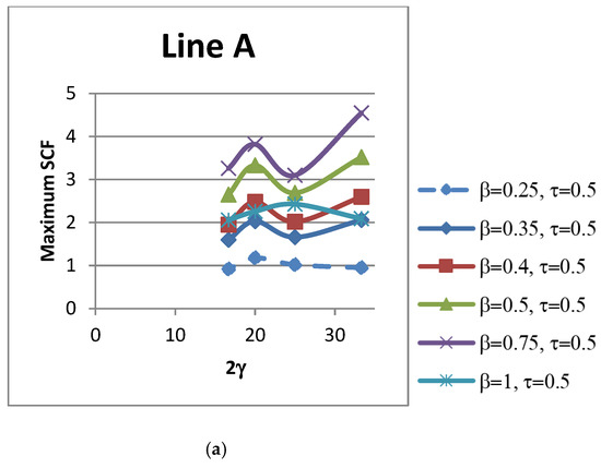 The influence of the non-dimensional parameter β on peak SCFs of concrete-filled SHS-SHS T-joints under in-plane brace bending is shown in Figure 8 and Table 11. The peak SCFs in concrete-filled SHS T-joints (with 2γ = 25, 33) occurred when β = 0.5. For T-joints with 2γ = 25 and 33, the maximum SCFs increased with the increase in value of β and decreased when β = 0.75. The peak SCFs in concrete-filled SHS T-joints (with 2γ = 20, 16.67) occurred when β = 0.75. Furthermore, Figure 9 shows the influence of β on SCFs along lines A–E. Figure 9 shows that SCF trends along lines A and E located on the brace are similar and non-linear. In general, the SCFs trends along lines B, C, and D, which are located on the chord, are comparable.