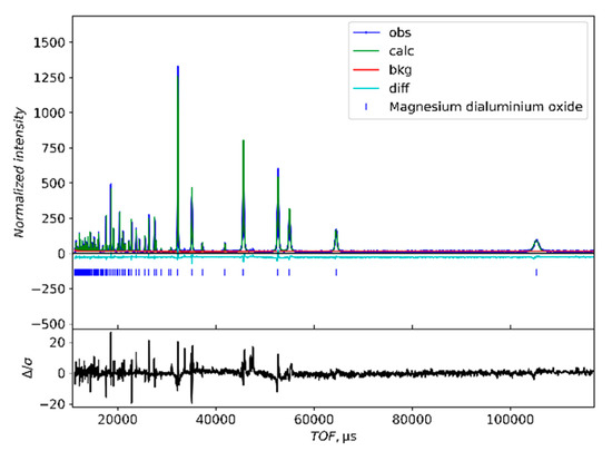 As with the XRD results, the neutron diffraction patterns of both the XD and the MA materials indexed to the spinel structure. Figure 2 shows the neutron diffraction pattern of XD1500C, which is representative of the patterns collected for all of the materials in this study. Table 1 contains the peak listings of the main peaks indexed to the spinel structure. As seen in Figure 2, only peaks from a time of flight (TOF) of about 30,000 µs and larger are labeled with Miller indices. The labeled peaks were enough to show that the NPD pattern was consistent with spinel formation. The higher-order planes were too close to one another to label in this format but were included in the refinements. The most intense peak was at a TOF of roughly 32,255 µs, corresponding to the (440) plane. The next most intense peak was at approximately 45,631 µs, attributed to the (400) plane. The peak from the (222) plane was the third most intense peak at a TOF of about 52,692 µs. As with the XRD patterns, all of the NPD patterns were consistent with the formation of single-phase MgAl2O4.