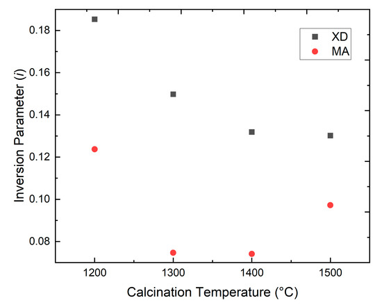 The degree of inversion of the mechanically activated powders did not show a clear trend with temperature. The inversion parameter was about 0.124 for MA1200C. The MA1300C and MA1400C samples each had lower values of cation site disorder with values of i = 0.075 for MA1300C and 0.074 for MA1400C. In contrast, increasing the calcining temperature to 1500 °C for MA1500C led to an increase in the inversion parameter to 0.097. As with the XD powders, the decrease in inversion parameter when calcination temperature increased from 1200 °C to 1400 °C was thought to be due to same mechanism that led to the decrease in inversion with increasing calcination temperature in the XD powders, i.e., increased cation mobility with increasing temperature. The increase in inversion parameter for MA1500C is thought to be due to a competing mechanism that increases cation disorder. While increasing temperature increases mobility and allows cations to move to their equilibrium positions, higher temperatures may also promote disorder through the increase in entropy and site disorder with increasing temperature.
