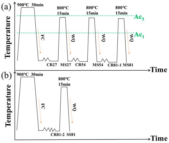 The rolling process was performed in a cold rolling mill with the roller diameter of 180 mm. Figure 2 illustrates the processing route and marks the names of samples at each stage. The experimental steel was first held at 900 °C for 30 min to fully complete austenitization, followed by cooling within the furnace to obtain a ferrite/pearlite initial structure. The MS process was deformed in a single pass at 27% of the total thickness, and then the samples were held at 800 °C for 15 min. Water quenching was performed to obtain the dual-phase structure. This process was cycled three times. The SS process, on the other hand, performed a single deformation of 81%, followed by holding at 800 °C for 15 min, and a final water quenching.