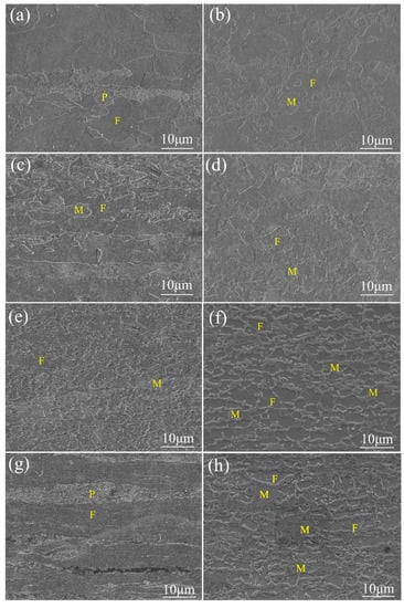Microstructure of (a) CR27; (b) MS27; (c) CR54; (d) MS54; (e) CR81-1; (f) MS81; (g) CR81-2; and (h) SS81, M (martensite), F (ferrite), P (pearlite).