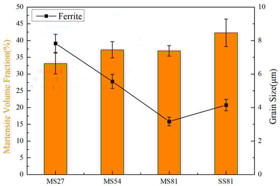 Ferrite grain size and volume fraction of martensite in MS27, MS54, MS81, and SS81.