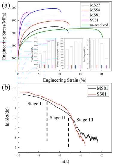 (a) Engineering stress–strain curves of MS27, MS54, MS81, and SS81, and (b) differential C-J plots of ln(dσ/dε) versus ln(ε) for MS27, MS54, MS81, and SS81.