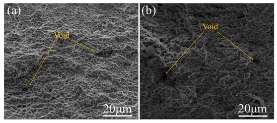 Figure 7 shows the observations of the fracture surfaces of MS81 and SS81. Both samples show a ductile fracture. The fracture of MS81 (Figure 7a) is mainly composed of shallow dimples and a few large dimples. Large dimples may be due to the fracture of larger martensite grains, resulting in larger cavities. SS81 (Figure 7b) contains a large number of voids and some small areas of quasi-cleavage surfaces (identified by green arrows).