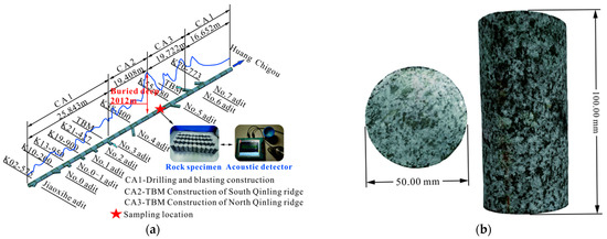 The diorite that was used in this test came from a deeply buried hard rock tunnel in the north of the Qinling Mountains, Shaanxi Province, China (Figure 1a), and is mainly composed of plagioclase, amphibole, and some minor dark minerals. The crystals in the rock exhibit a high degree of crystallization, and their shapes show various blocky structures of variable size. In the laboratory, a large number of cylinder-shaped samples, as shown in Figure 1b, were formed by drilling, cutting, and grinding. In order to reduce the influence of machine error and large microdefects on the test results, all samples were ground to ensure that the non-parallelism and diameter error of the upper and lower end faces was less than 0.02 mm. Subsequently, all rock samples were tested by using an RSM-SY5 (T) non-metallic acoustic detector (Wuhan Zhongyan Technology Co., Ltd., Wuhan, China) to remove rock samples with large acoustic dispersion phenomena.
