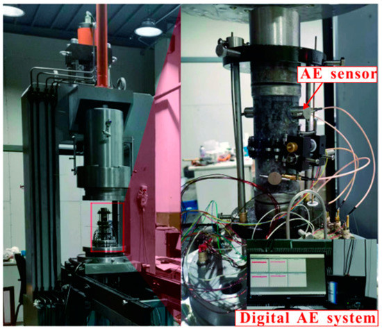 AE is a non-destructive testing technique and has been widely used in the field of rock mechanics to become one of the most effective methods for revealing internal fracture behavior, failure mode, and damage evolution of loaded rock [12,13,14,15]. For example, Eberhardt et al. [16] studied the AE characteristics during the failure of granite by using AE detection technology, finding that the onset of AE activity closely corresponds to the initiation of stress-induced cracks in the rock. Lokajíček et al. [17] performed AE tests on granite and granulite, revealing that their crack-initiation stresses are 45% and 85% of their peak strength, respectively. Wang et al. [18] conducted AE tests on red sandstone, showing that the AE energy corresponding to shear failure was significantly greater than that corresponding to tensile failure. Zhang et al. [19] investigated the damage evolution and failure mode of coals under loading and unloading conditions by using the space–time dimension cluster analysis method and AE positioning technology. The results show that the AE events of short, middle, and long link reflected the local damage, overall, and random damage processes of coals, respectively. Additionally, AE events, AE energy, AE counts, and other AE parameters are used to characterize the internal damage evolution of rocks [20,21,22,23,24]. Thomas et al. [25] studied AE evolution characteristics during the damage evolution of granite via loading and unloading triaxial tests. The results demonstrated that, with the increase of freeze–thaw cycle times, the acoustic emission events of rocks were more active and presented local high-density release characteristics. Song et al. [26] used AE technology to study the mesoscale damage characteristics of freeze–thaw limestone under uniaxial compression, revealing its progressive damage mechanisms. Yang et al. [27] applied AE and X-ray CT observations to study the influence of joint dip on the fracture evolution mechanisms of discontinuous jointed rock masses, revealing that tensile wing cracks were dominated for smaller joint angles and shear wing cracks were dominated for large joint angles during. Zhang et al. [28] characterized the damage processes affecting granite by using different AE characteristics measured during uniaxial compression, finding that the initial damage time inferred from AE events was earlier than the macroscopic deformation.