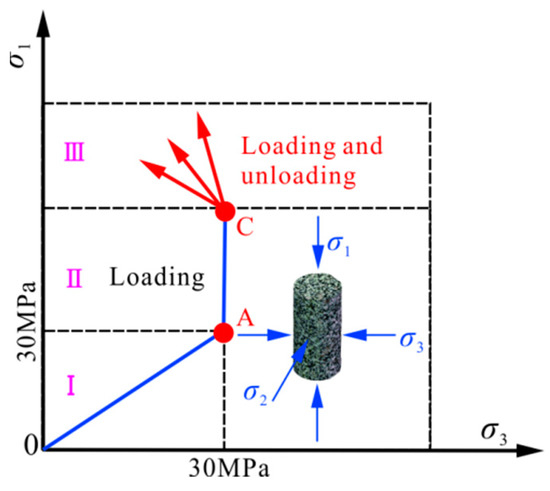 The confining pressure of the loading and unloading test is 30 MPa; the peak strength of rock sample under the same confining pressure is 254.727 MPa; and its unloading confining-pressure rates are 0.008 MPa·s−1, 0.016 MPa·s−1, and 0.032 MPa·s−1, respectively. The test scheme is shown in Figure 3. The detailed scheme is as follows: (I) Increase the confining pressure and axial pressure at a rate of 0.05 MPa·s−1 to 30 MPa at point A. (II) Maintain the confining pressure, and then increase the axial pressure at a rate of 0.1 mm·min−1 through displacement control to 70% of the peak strength of the rock sample, i.e., point B. (III) Reduce the confining pressure at a predetermined unloading confining-pressure rate (0.008 MPa·s−1, 0.016 MPa·s−1, and 0.032 MPa·s−1), while maintaining a constant axial loading rate until failure of the rock sample.
