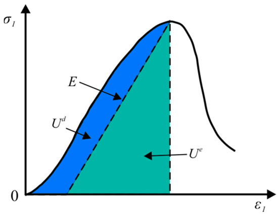 If thermal energy is neglected in the energy exchange process of the rock sample, the total energy, U, given by the test apparatus to the rock sample can be considered to be mainly converted into elastic strain energy, Ue, and dissipated energy, Ud (Figure 4) [30]. Here, elastic strain energy is stored inside the rock in the form of releasable energy, while dissipative energy is consumed by internal damage during deformation. Equation (1) can thus be replaced by the following Equation (4):
