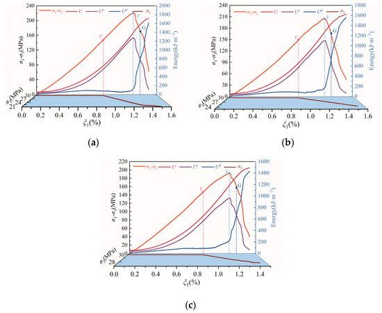 Energy evolution curves of diorite under different unloading confining-pressure rates: (a) 0.008 MPa·s−1, (b) 0.016 MPa·s−1, and (c) 0.032 MPa·s−1.