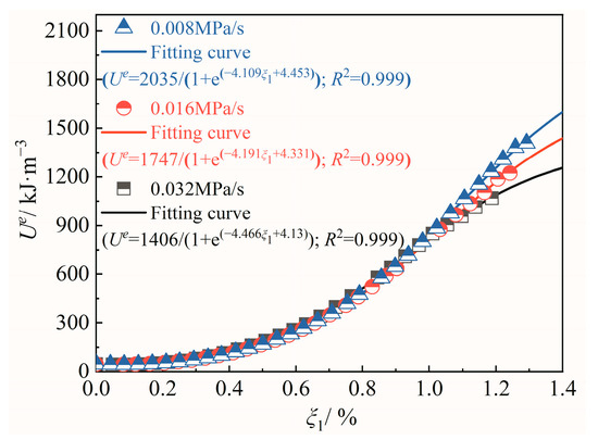 In order to investigate the nonlinear damage characteristics of rock samples under different loading and unloading paths, the strain energy and axial strain data of diorite is brought into Equation (10) to obtain the nonlinear evolution curves of the pre-peak strain energy of diorite under different unloading confining-pressure rates, as shown in Figure 7.