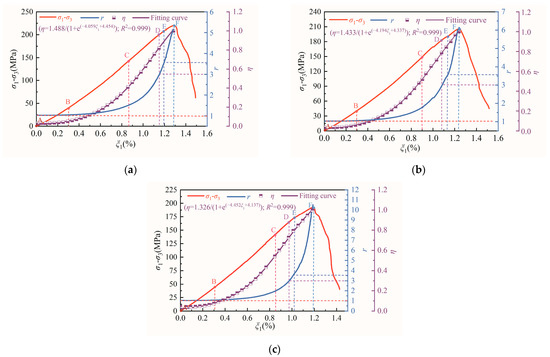 where σ1i, σ1i−1 and Δε(1i)−(1i−1) are the stress and strain difference of any adjacent two points in the axial stress–strain curve, respectively. Similarly, σ3i, σ3i−1 and Δε(3i)−(3i−1) are the stress and strain differences between any two adjacent points in the lateral stress–strain curve, respectively, and m is the total number of sample points.