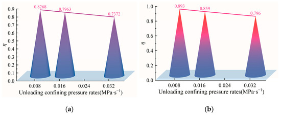 From the above analysis, it can be concluded that the evolution of strain energy before the peak strength of diorite under different unloading confining-pressure rates shows period-doubling bifurcation and chaotic mechanical behavior. To explore the influence of the unloading confining-pressure rate on the nonlinear mechanical behavior of rock samples, η (the ratio of strain energy to maximum strain energy) values corresponding to the thresholds of period-doubling bifurcation and chaotic phenomenon before the peak strength of diorite under different unloading confining-pressure rates in Figure 7 are shown in Figure 8.