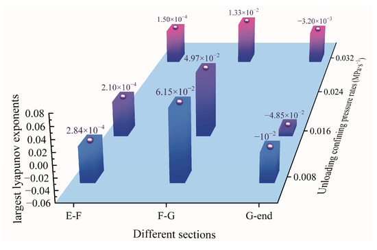 The maximum Lyapunov exponent is an important parameter for judging whether the nonlinear time sequence is a chaotic system and for evaluating its degree of chaos. Lyapunov exponents greater than 0 indicate a chaotic state, whereas Lyapunov exponents less than 0 denote a stable state. When the Lyapunov exponent is equal to 0, the material is considered to be in a critical state between stability and chaos. From Figure 9, it is found that, under different unloading confining-pressure rates, the E–F section before the peak strength of diorite is in a weak chaotic state, whereas the F–G section after the peak strength is in a strong chaotic state; the degree of chaos in this section decreases with increasing unloading confining-pressure rates. The G–end section is in an orderly steady state, indicating that the rock system in this section has completely failed.