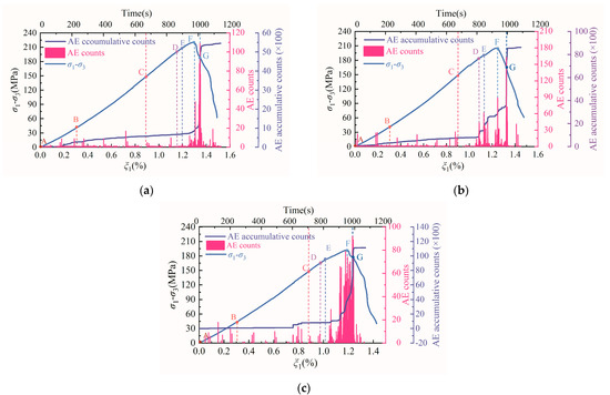 During loading and unloading, the closure, initiation, propagation, and penetration of microcracks throughout the rock sample system is accompanied by AE events. As shown in Figure 10 and Figure 11, before the unloading confining pressure (points A–C), the AE counts, cumulative AE counts, AE energy, and cumulative AE energy all changed slightly with the increasing axial-stress difference. At the initial stage of unloading confining pressure (points C–D) and during the period-doubling bifurcation D–E section, the AE counts, cumulative AE counts, AE energy, and cumulative AE energy also changed slightly, indicating that the internal damage of the rock-sample system is small in the A–E section of the rock sample. These characteristics show that the integrity of the rock in A–E section is good, proving its stable and orderly nonlinear dynamic behavior. As the axial-stress difference continues to increase, the AE counts, cumulative AE counts, AE energy, and cumulative AE energy begin to increase significantly in the E–F section, reflecting an increase in the internal damage of the rock sample. When the axial-stress difference crosses the unloading peak stress F point and enters the post-peak F–G section, the AE counts, cumulative AE counts, AE energy, and cumulative AE energy show the characteristics of rapid increase, implying intense internal damage. When the post-peak stress–strain curve of the rock sample falls to the G–end section, the AE counts, cumulative AE counts, AE energy, and cumulative AE energy begin to plummet, indicating that the rock sample system has completely failed. These AE evolution characteristics indicate that the rock-sample system exhibits a chaotic state in the E–G section and a steady state in the G–end section.