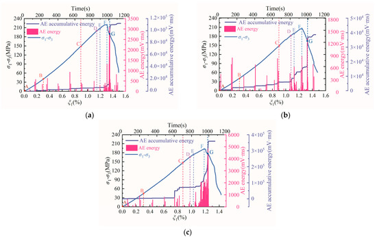 As shown in Figure 5, the curves of total and strain energy in the rock samples at the initial compression stage almost coincide, indicating that the hydrostatic pressure during the initial loading stage results in the closing of most of the initial microcracks in the rock sample, such that the energy dissipation at this stage is low. When the axial stress difference increases, the total energy and strain energy show an increasing upward concave trend under different unloading confining-pressure rates, whereas the dissipated energy first increases slowly and then gradually tends to become stable, implying that the internal damage to the rock sample is relatively small but that the strain energy rapidly accumulates during this process. After the initial stage of unloading confining pressure, i.e., after point C, the increment of the dissipated energy of the rock sample is small, but the increment of total energy and strain energy remains significant. This reflects the fact that the energy input from the axial direction of the rock sample is much greater than its dissipated energy. Following the continuous decrease of confining pressure and the increase of axial stress difference, the dissipated energy of the rock sample begins to increase gradually. When the axial stress difference exceeds the unloading peak stress, the dissipated energy begins to rise rapidly, while the elastic strain energy begins to decline rapidly. Before the G point of the stress–strain curve, although the bearing capacity of the rock sample decreases, the total energy still shows an increasing trend due to strong lateral constraints. After passing the G point, the total energy curve tends to gradually become stable, indicating the failure of the rock sample.