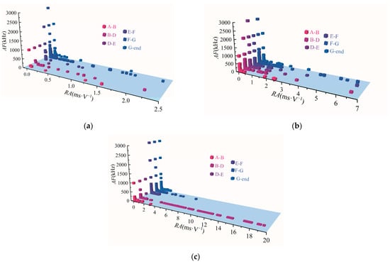 As shown in Figure 12, under different unloading confining-pressure rates, the AF–RA scatter distributions of A–B, B–D, D–E, E–F, F–D, and G–end sections of diorite are mainly distributed at 0–1000 kHz and 0–2 ms·V−1, but during unloading, the E–F, F–D, G–end sections exhibit some larger AF parameters. It can be seen that the internal crack propagation of diorite in the process of loading and unloading under high confining-pressure condition is mainly dominated by tension–shear mixing. Moreover, during the unloading process, some tensile cracks with high AF parameters are induced inside the rock due to the unloading effect.