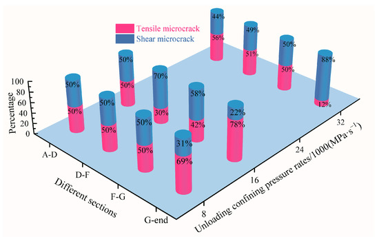 Percentage of tensile and shear microcracks in different damage sections of diorite under different unloading confining-pressure rates.
