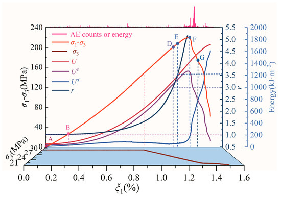 For the conventional triaxial loading and unloading test, the elastic strain energy can be calculated using Equation (5) [31]: