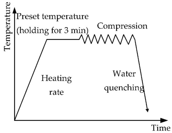 The true stress–strain curves of the sample were discovered by a Gleeble-3500 gadget. The gadget is composed of a heating system, mechanical system, and digital control system. The maximum heating rate can reach 10,000 °C/s, the temperature control accuracy can reach ±1 °C, the maximum cooling rate can reach 10,000 °C/s on the sample surface, the maximum tensile and compressive static loads are 100 KN, the maximum axial displacement rate is 1000 mm/s, the minimum axial controllable rate is 0.01 mm/s, and the displacement measurement accuracy is 0.002 mm. Isothermal compression was tested at strain rates of 0.001 s−1, 0.01 s−1, 0.1 s−1, and 1 s−1, as well as temperatures of 723 K, 748 K, 773 K, 798 K, and 823 K. The sample’s height was reduced to 60%. During the experiment, the specified temperature was reached at a heating rate of 278 K/s. The deformation temperature of the sample was measured by a platinum–rhodium thermocouple that was welded to the center region of the sample surface. A heating rate that is too fast will cause deformation and warping of the sample, so the sample was heated to the required temperature and maintained there for 3 min before isothermal compression. At the end of the test, the sample was quenched in water. The experimental steps of the thermal compression test were shown in Figure 3. The axial surface of the sample was selected to observe the microstructure properties. The metallographic sample was prepared by chemical etching and mechanical polishing. The chemical etchant consisted of 95 vol.% H2O, 2.5 vol.% HNO3, 1.5 vol.% HCl, and 1 vol.% HF. The microstructure of the sample was observed by Leitz3DMIXT optical microscope.