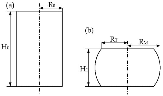 Here, P is the true stress before correction; σ is the corrected flow stress; R and H are the instantaneous values of the radius and height of samples, which can be calculated according to Equations (2) and (3), respectively; and m is the friction factor calculated according to Equation (4).