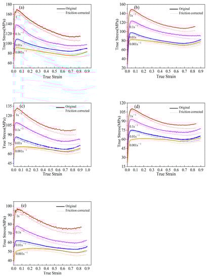 The solid lines in Figure 5 show the true stress–strain curves of B4Cp/6063Al composites under different deformation temperatures. It can be seen from Figure 5 that the deformation behavior of B4Cp/6063Al composites can be roughly divided into two stages. In the initial stage, the flow stress increases rapidly to the peak as the strain increases. The main reason is that the dislocation density increases sharply, and dislocation motion accelerates during the deformation process of the material. Additionally, dislocation motion limited to a certain range cannot easily overcome the obstacles, dislocation tangles, pinning, and B4C particles, which results in work hardening.