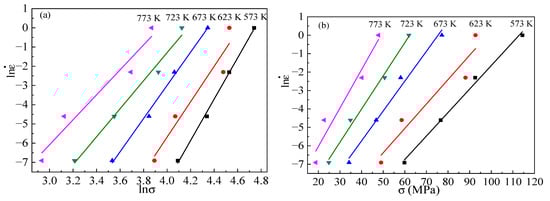 When the material constant (A, Q, , n) is obtained, the variation law of the flow stress of the alloy under high-temperature plastic deformation can be obtained. When the stress level is unchanged, there is a linear relationship between and . Here, is the strain ratio. According to the experimental results of deformation at different temperatures and strain rates, can be obtained. When aluminum and aluminum alloy composite materials are used, the value and applied stress are very small and can be ignored. Equation (15) can be obtained.