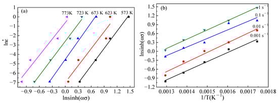 According to the changes in the peak flow stress, the figures of and can be plotted for different temperatures. As shown in Figure 6, the natural logarithm of the strain rate shows a significant linear correlation with the natural logarithm of the peak stress; similarly, the natural logarithm of the strain rate also has a significant linear correlation with the peak stress. According to Equations (12) and (13), the slopes of the lines in Figure 6 gives an approximate value for n and β. The linear regression effects show that the stress exponent n and the material consistent β are about 11.397 and 0.123. This gives a material constant α of about 0.011.