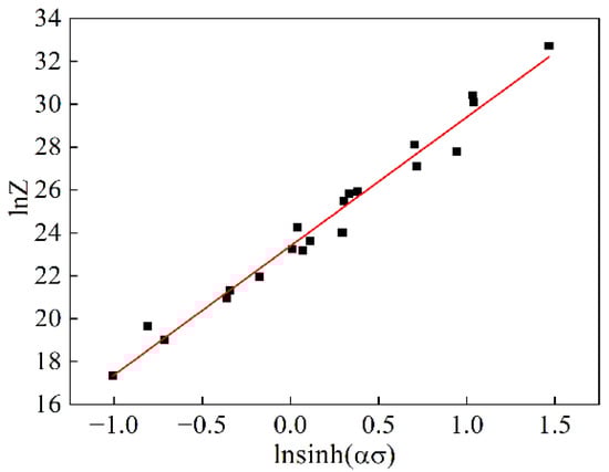 The value for α and n were introduced into Equation (18) to calculate the values of Z and , and to plot . As shown in Figure 8, it can be seen that has a highly linear correlation with . According to Equation (19), the exact n-values are derived from the slope of , and is obtained from the intercept of . Figure 8 shows the plot of with slope and intercept at about 8.394 and 43.333, respectively. Therefore, the values of the material constant A and the stress exponent n are 6.596 × 1018 and 8.394, respectively.
