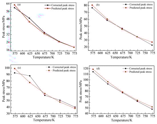 Comparison between the corrected and the predicted peak stress of B4Cp/6063Al composites: (a) , (b) , (c) , (d) .