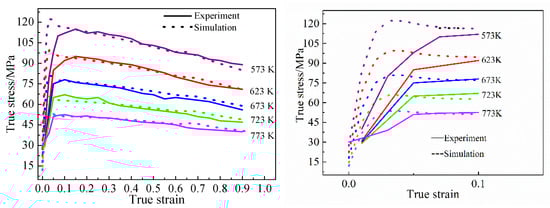 Figure 10 illustrates the agreement between simulated and experimental data, indicating the validity of the constitutive equation for the B4Cp/6063Al composite. The higher the temperature and strain, the higher the agreement between the simulation results and the experimental results, which is almost consistent with the true stress–strain law obtained in the literature at a specific temperature. At a certain deformation temperature, when the strain rate is high, the time required for the specimen to reach a certain amount of deformation is shortened, the dislocation proliferation rate is increased during the deformation process, and the dislocations are interlaced and entangled with each other, resulting in an increase in the critical stress required for deformation, and then higher flow stress. With the increase in strain, various softening mechanisms gradually weaken the hardening effect, and an obvious rheological softening phenomenon appears. When the strain rate is constant, with the increase in deformation temperature, the flow stress decreases and the degree of rheological softening weakens. As shown in Figure 10, since the strain is loaded from 0 in the simulation process, the actual stress yield point in the simulation results appears earlier than the experimental results, but the overall trend is consistent, which proves that the constitutive equation can be used for finite element simulations and is helpful to further study of the plastic forming properties of materials.