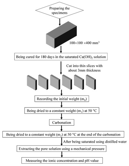 A schematic of the experimental procedure is illustrated in Figure 1. The cubic mortar specimens with a size of 400 × 100 × 100 mm3 were prepared, and all of the specimens were cured in a saturated calcium hydroxide solution for six months. Then, the cubic specimens were cut into thin slices with a thickness of approximately 3 mm in order to shorten the next experimental period. In addition, the top and bottom surfaces were omitted. Seven slices were selected, and their initial weights were measured using a high precision balance with 0.1 mg. Then, these seven thin specimens were dried in a vacuum drying oven at 50 °C. The weights of the thin specimens were recorded every seven days during the drying process, and when the difference between two continuous recorded weights was less than 0.1%, the specimens were assumed to be at a constant weight. Specifically, this indicated that they did not contain any capillary pore water. Next, the specimens were placed into a closed carbonation chamber at 20 °C where the CO2 volume concentration and the relative humidity were 20% and 70%, respectively. To make these seven slices completely carbonated, the carbonation period was set at 60 days. At the end of the carbonation, a 1 wt% phenolphthalein aqueous solution was sprayed on the fracture surface of a thin specimen, and it was found that the color did not change. Then, these specimens were immediately again dried to a constant weight, and their weights were again recorded. Based on the reaction (CO2 + 2OH− → + H2O) and the variation in the weights of the specimens, the CO2 moles (NCO2) that reacted with the specimens could be calculated using the following equation: