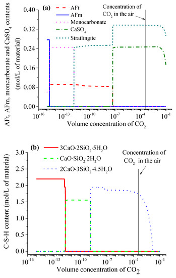 Assuming that the CO2 amount was sufficient, the effects of the CO2 concentrations on the carbonation behaviors of the cement-based materials are discussed in the context of the thermodynamic model in this section. Figure 2 plots the hydrate assemblages of the completely carbonated mortar as a function of the CO2 concentrations. The CO2 gas cannot dissolve into any aqueous solution when the CO2 concentration is too low, and thus, the cement-based materials do not undergo any carbonation reactions when the CO2 volume concentration is lower than 1.95 × 10−15 (Figure 2). When a sufficient CO2 amount is provided, the CO2 concentration that can trigger the AFm carbonation is the lowest among all of the cement hydrates, and it is followed by the CH, C-S-H and AFt. In addition, apart from the C-S-H phase with a Ca/Si ratio = 1.0, every hydrate phase has the corresponding CO2 concentration threshold, above which the corresponding carbonation reaction can be triggered. These values, predicted by the thermodynamic model, are 1.95 × 10−15 for the AFm (Figure 2a), 1.0 × 10−13 for the CH (Figure 2c) and 5.50 × 10−8 for the AFt (Figure 2a). In addition, the C-S-H phases with different Ca/Si ratios have different CO2 concentration thresholds, such as 1.91 × 10−12 (C-S-H with Ca/Si ratio = 1.5) and 1.35 × 10−9 (C-S-H with Ca/Si ratio = 1.0). Overall, the effect of the CO2 concentration on the carbonation reactions of CaSO4 and the low-Ca/Si ratio C-S-H phases is less significant than that of the AFm, AFt, CH, monocarbonate, strätlingite and the high-Ca/Si ratio C-S-H phases. Moreover, the CO2 volume concentration in the current atmosphere is approximately 3.8 × 10−4 (which has been remarked in Figure 2), and this means that most of the hydrate phases will be completely carbonated if sufficient CO2 penetrates into the cement-based materials.