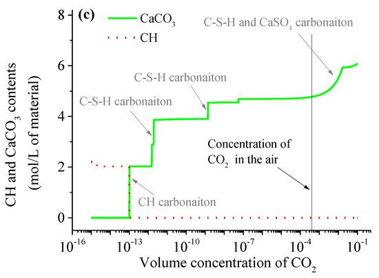 The simulation results (Figure 2a) indicate that the AFm carbonation leads to the improvements in the AFt and monocarbonate contents. However, with an increase in the CO2 volume concentration, the monocarbonate can also be carbonated (see Figure 2a), and simultaneously, the first decalcification of the C-S-H phase occurs (see Figure 2b). Subsequently, the AFt phase undergoes carbonation accompanied by the formation of CaSO4 (see Figure 2a). However, with the continuously increasing CO2 concentration, CaSO4 is also gradually carbonated. In addition, the CaCO3 content increases when any hydrate phase, apart from the AFm (i.e., CH, C-S-H, AFt, monocarbonate and CaSO4), is carbonated, which can be seen in Figure 2. This calculation result is in line with the well-known conclusion that CaCO3 is the most primary product of the carbonation reactions of the cement hydrates. Figure 2b illustrates the contents of the C-S-H phases with different Ca/Si ratios at different CO2 volume concentrations, and it is clear that the C-S-H has two different decalcification behaviors with the increasing CO2 concentration, which means that the rise in the CO2 concentration can cause a completely carbonated C-S-H to possibly experience three stages. In the first stage, it cannot induce the decalcification of the C-S-H due to the very low CO2 concentration. When the CO2 volume concentration is between 1.91 × 10−12 and 1.35 × 10−9, the C-S-H phase with a Ca/Si ratio = 1.5 is completely decalcified into that of a Ca/Si ratio = 1.0. When the CO2 volume concentration is above 1.35 × 10−9, the C-S-H is completely decalcified into that of a Ca/Si ratio = 2/3, which is the third stage. Castellote et al. [17] employed 29Si Magic Angle Spinning-Nuclear Magnetic Resonance (29Si MAS NMR), TG and XRD to investigate the chemical changes and the phase analysis of OPC pastes carbonated at different CO2 concentrations. They found that the Ca/Si ratio of the C-S-H phase became lower with the increasing CO2 concentration during the carbonation process. This agrees well with the simulation results of the proposed thermodynamic model. The simulation results in Figure 2b also indicate that the CO2 concentration in the current atmosphere can hardly cause a carbonation reaction of the C-S-H phase with a lower Ca/Si ratio, for example, 2CaO⋅3SiO2⋅4.5H2O. However, when the CO2 concentration is higher than 1.62%, the C-S-H phase is completely carbonated. The experimental results reported by Castellote et al. [17] also indicate that the C-S-H phase completely disappears when the CO2 concentration is 10% and 100%. In addition, the decalcification of the C-S-H phase caused by the carbonation results in the formation of strätlingite, has also been reported by Shi et al. [26]. Figure 2c presents the variations in the CH and CaCO3 contents in cement hydrates as a function of the CO2 concentration. The CH cannot be carbonated when the CO2 concentration is lower than 1.0 × 10−13. In addition, it can be clearly observed that the CaCO3 content in the completely carbonated cement-based materials as a main carbonation product is closely related to the CO2 concentration.