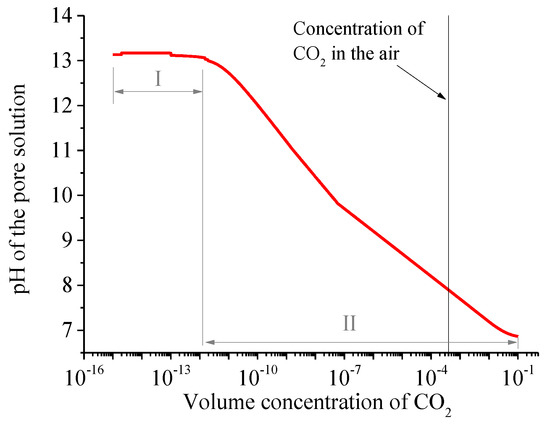 The thermodynamic model predicts the pH in the pore solution as a function of the CO2 volume concentration, as illustrated in Figure 3. With an increase in the CO2 volume concentrations, the changing curve of the pH value in the pore solution can be divided into two stages: in the first stage, because the CO2 concentration is very low, it does not cause any carbonation reactions in the cement-based material, or only the AFm and CH phases are carbonated, and the pH value of the pore solution has made little change and is above 13.0. In the second stage, the pH value of the pore solution is susceptible to the effect of the CO2 concentration. When the decalcification of a high-Ca/Si ratio C-S-H occurs, the pH value begins to decrease. Some investigations have indicated that the pH value of the concrete pore solution that can cause a transition from passive to active corrosion of the embedded reinforcing steel is between 10 and 9.4, and this value may be higher in the presence of chloride ions [6,27]. By combining this with the results in Figure 3, it is concluded that the carbonation cannot induce the corrosion of the reinforcing steel when the CO2 volume concentration is below 3.39 × 10−8. However, the CO2 concentration in the current atmosphere is about 3.8 × 10−4, and this means that the current atmosphere is capable of inducing the corrosion of the reinforcing steel.