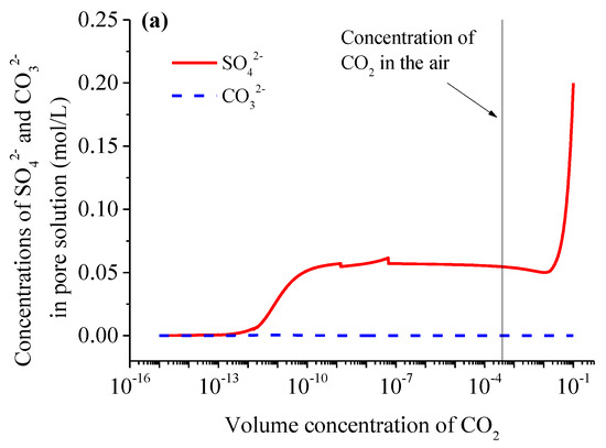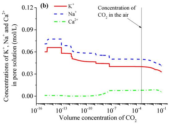 The above results indicate that the carbonation reactions at different CO2 concentrations are different, and since , and Ca2+, in the pore solution, participate in the carbonation reactions of the hydrate phases, the ionic concentrations of the pore solution at different CO2 concentrations are determined by the corresponding carbonation reactions. Figure 4 plots the ionic concentrations of , , Ca2+, K+ and Na+, in the pore solution, as a function of the CO2 volume concentration predicted by the thermodynamic model. The concentration has a significant increase when CaSO4 undergoes a carbonation reaction with an increase in the CO2 concentration. The concentration remains very low and is barely affected by the CO2 concentration. This is because it is very difficult for CO2 to dissolve into an aqueous solution when the CO2 concentration is low, and with the increasing CO2 concentration, produced due to the CO2 dissolution participates in the carbonation reactions, existing as CaCO3 or a monocarbonate. The Ca2+ concentration displays an increase only when the AFt is carbonated with the increasing CO2 concentration. In addition, Na+ and K+ do not participate in any carbonation reactions, and some carbonation reactions can increase the amount of water in the pore solution from the insight of the macroscopic chemical reactions, e.g., CO2 + Ca(OH)2 → CaCO3 + H2O, and there are no species transports in a closed system. Thus, the Na+ and K+ concentrations show a decrease (Figure 4b), in particular when the carbonation reaction of a hydrate phase is triggered.
